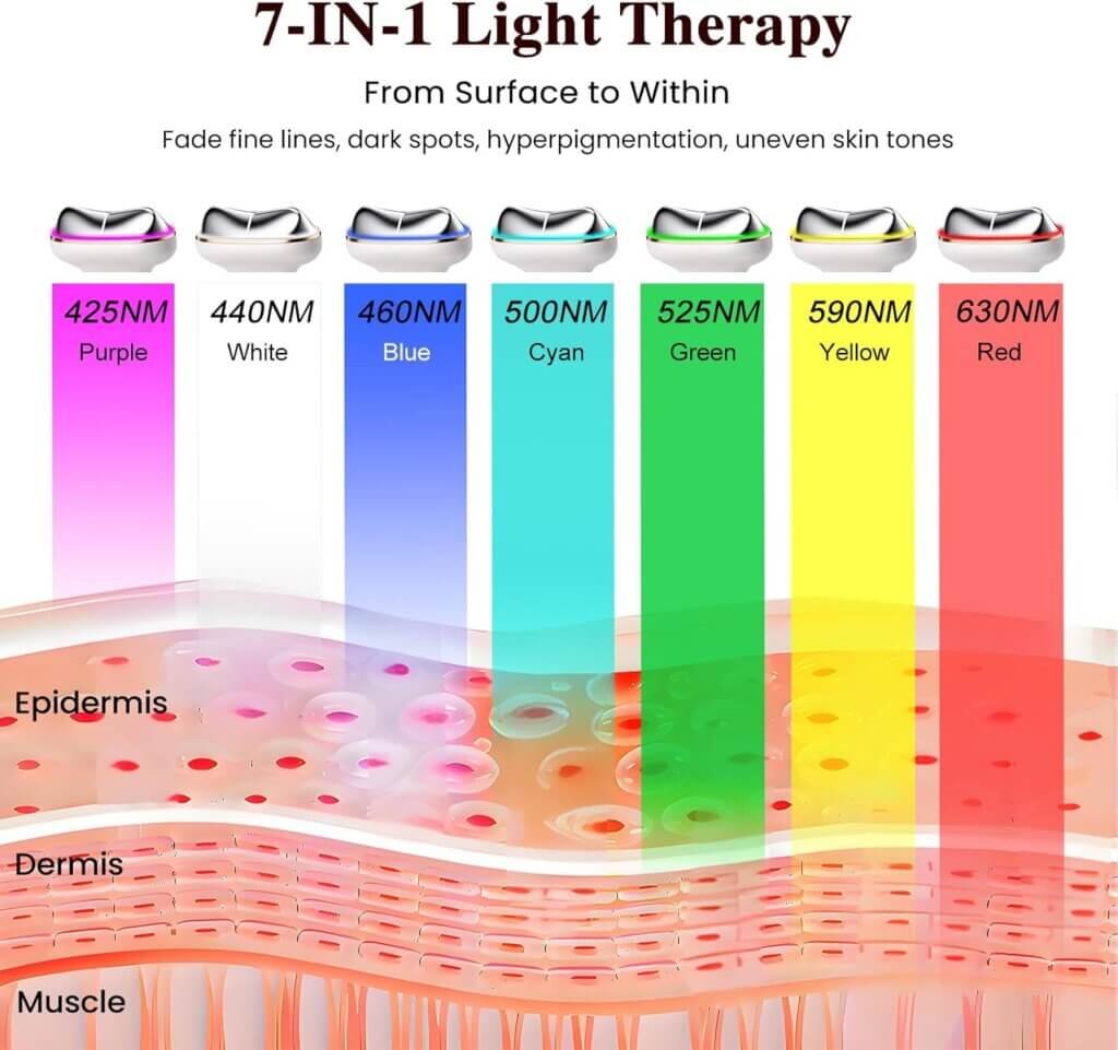 • 7-Color Red Light: Fights wrinkles, dullness, and acne.